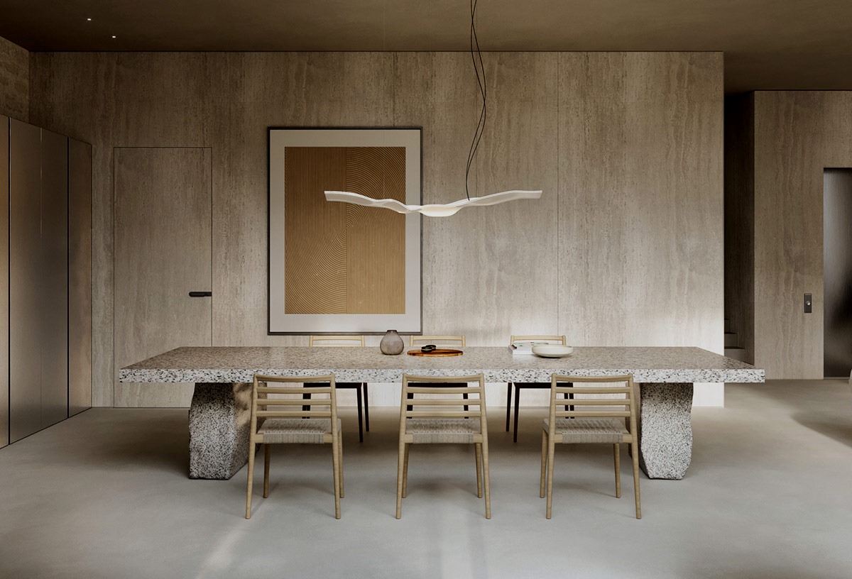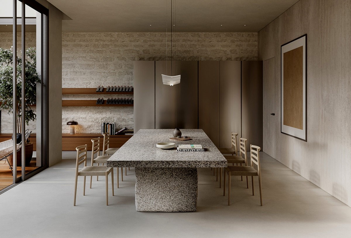 Σε αυτό το έργο σαλονιού, το αυστραλιανό στούντιο Αρχιτέκτονες Κόνραντ χρησιμοποίησε σκυρόδεμα και πέτρα για να δημιουργήσει μια μινιμαλιστική ατμόσφαιρα. Εδώ, το μάρμαρο αναδεικνύει το κεντρικό τραπέζι και τη βιβλιοθήκη. Η πέτρα βοήθησε να δοθεί η τέλεια αντίθεση μεταξύ των επίπλων και να προστεθεί λίγη λάμψη στο σημείο.